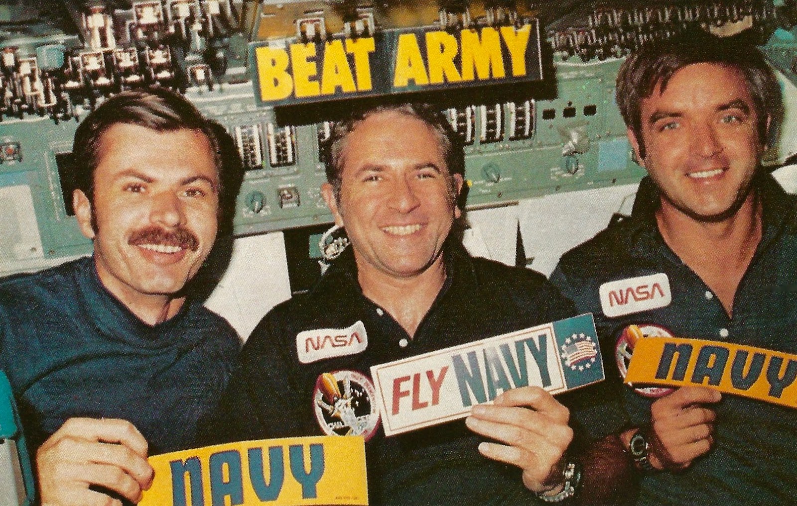 Following a precedent set early two decades ago during the Gemini program, three members of the STS-8 astronaut crew aboard the Earth-orbiting Space Shuttle Challenger reveal their military backgrounds and loyalties. Astronauts (left to right) Dale A. Gardner, Richard H. Truly and Daniel C. Brandenstein leave no mystery as to their alma mater and grid-iron sentimentalities as they display U.S. Navy stickers. The trio was photographed by Astronaut Guion S. Bluford on the flight deck. Truly is crew commander; Brandenstein, Pilot; and Gardner and Bluford, along with Dr. William E. Thornton are all mission specialists for this six-day flight.